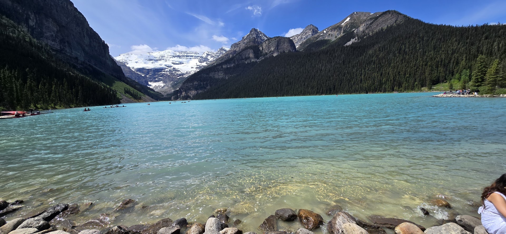 Moraine Lake’s turquoise waters shimmer beneath a cloudy sky, framed by evergreens and rugged peaks